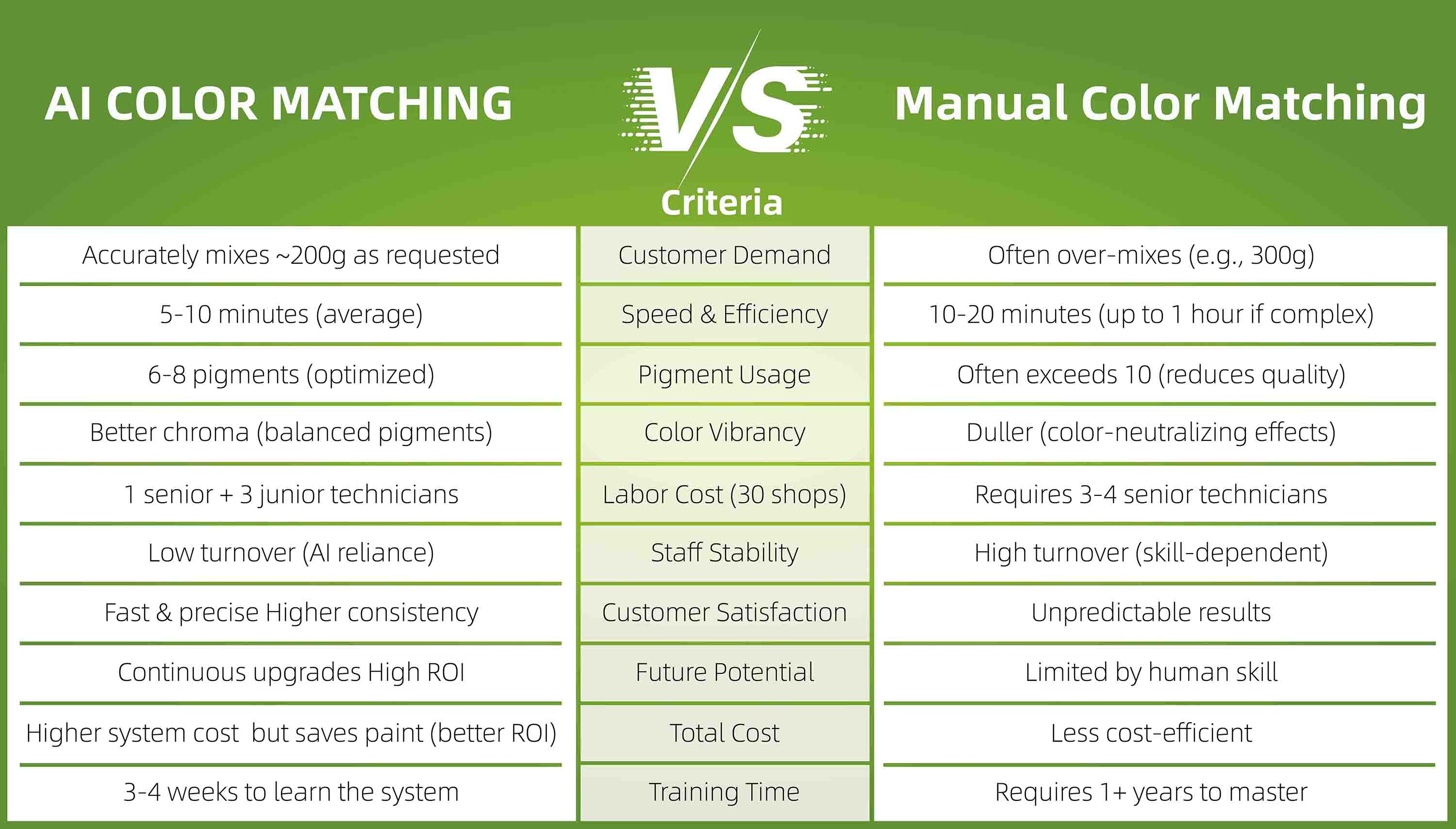 데이터는 명확합니다. AI 컬러 매칭은 속도, 정확도, 안료 효율, 노동 안정성, 그리고 장기적인 투자 수익률(ROI) 측면에서 측정 가능한 개선을 가져옵니다. 수동 컬러 매칭은 특히 고도로 맞춤화되거나 예술적 감각을 요하는 분야에서 여전히 중요한 위치를 차지하고 있지만, AI는 확장 가능하고 안정적이며 비용 효율적인 운영을 추구하는 현대 자동차 정비소에 더욱 현명한 선택으로 빠르게 자리 잡고 있습니다.